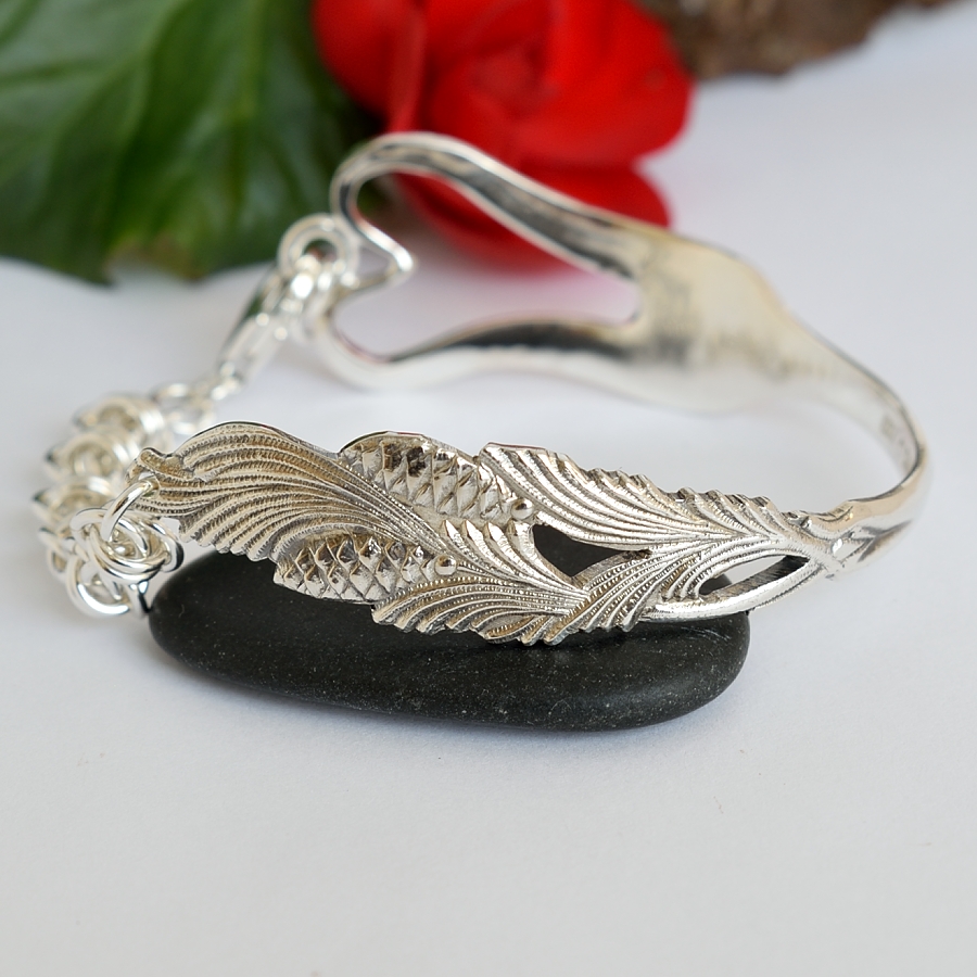 Pieni-sydänkäpy-rannekoru on designattu hopeisesta leikkelehaarukasta.