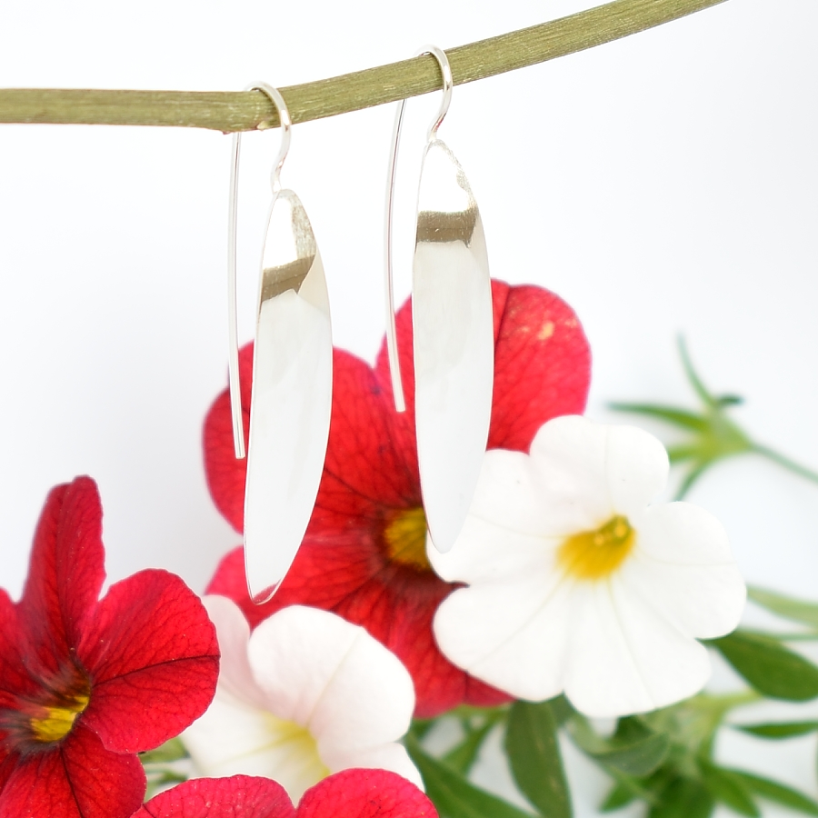 Hopeapaju-korvakorut, jotka on muotoiltu hopeisen lusikan pesästä. Koruissa on kiinteä, korkea koukkukiinnitys. Korujen koko on 40 x 7 mm.