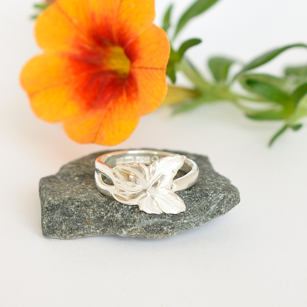 Verkkokaupassa myytävänä hopeisen lusikan varresta muotoiltu siro sormus.