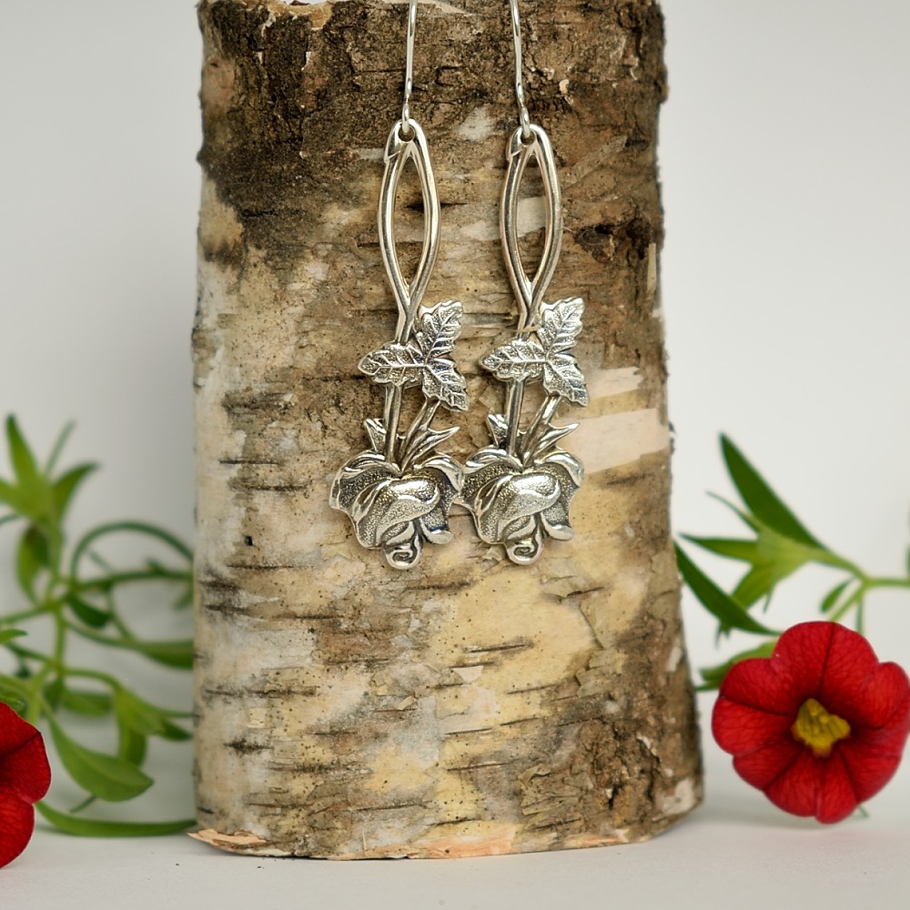 Kuvassa hopeisista Auranruusu lusikoista valmistetut riippuvat pitkät korvakorut.