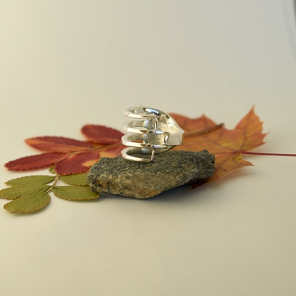 Kuvassa hopeinen kerrossormus toisesta kulmasta.