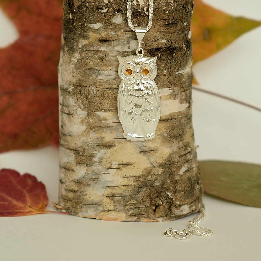 Kuvassa hopeaketjussa ihastuttava pieni hopeinen keltasilmäinen pöllö.