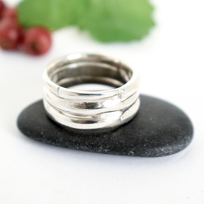 Aita-sormus, joka on muotoiltu hopeisten lusikoiden varsien pätkistä. Näin sormukseen on saatu kolme päällekkäistä kerrosta. Sormuksen leveys on 8 mm ja sormuksen koko on 18,5.