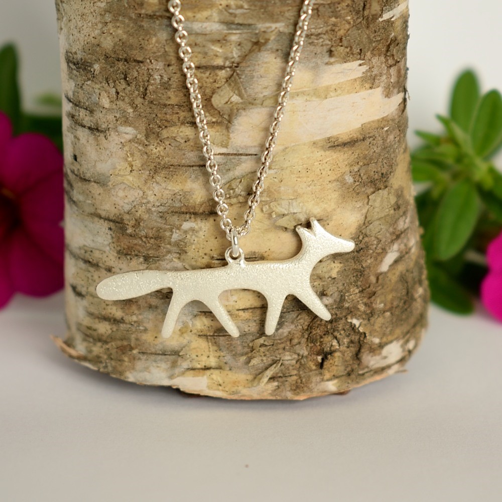 Inarin hopea Kettu riipus on kunnostettu ja puhdistettu second hand tuote. Korun koko on 17 x 36 mm. Sterling hopeisen korun pinta on hiekkapuhallettu ja kettu on ripustettu 50 cm pituiseen Sterling-hopeiseen ketjuun.