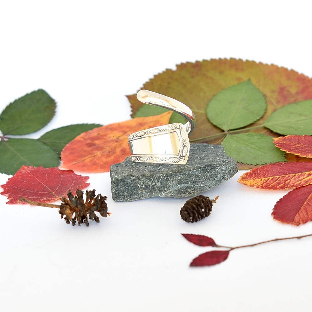 Kävyt-kierresormus, joka on muotoiltu Korutuote Tillanderin alun perin valmistaman erittäin kauniin hopeisen käpylusikan varresta. Lusikka on vuodelta 1988. Sormuksen korkeus on leveimmästä kohdastaan 25 mm ja sen koko on 18.