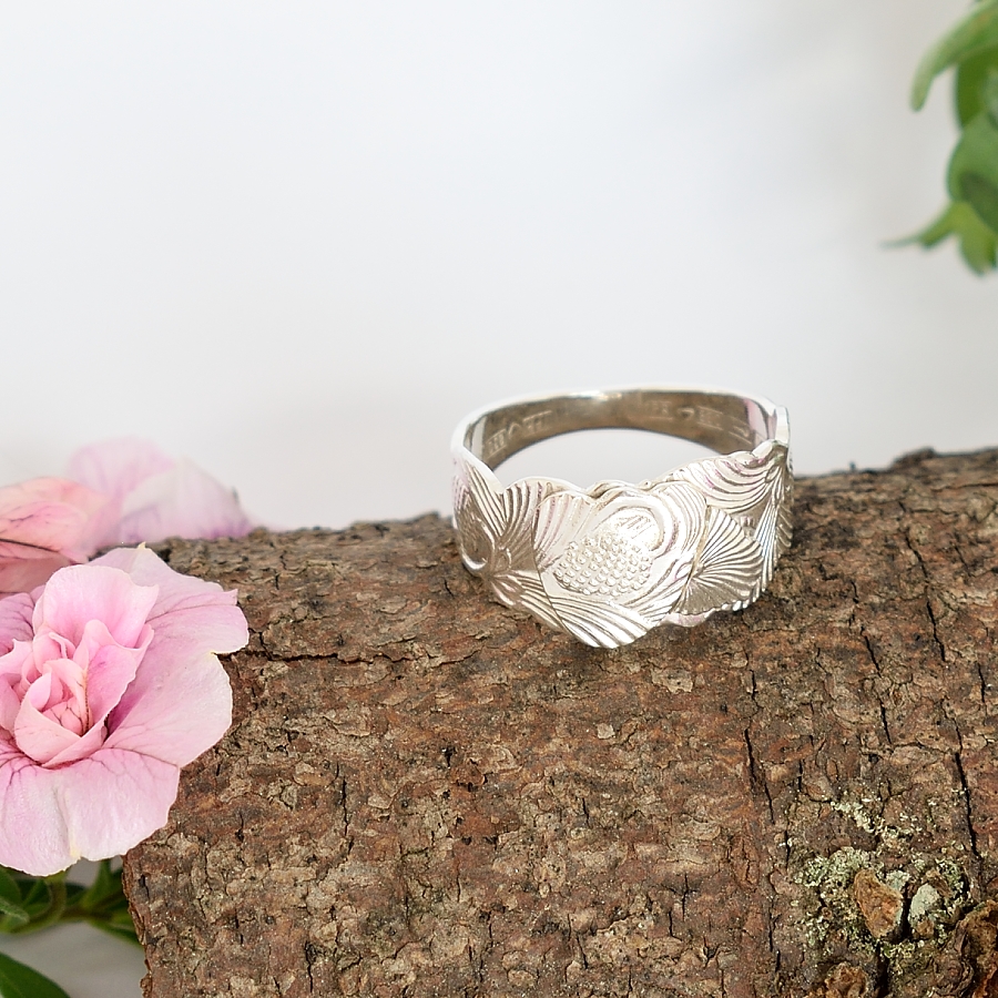 Kävyt-sormus, joka on valmistettu hopeisten sirojen Käpy-kahvilusikoiden varsista. Kuopiolaisen Tuomo Rissasen valmistamien lusikoiden hopeapitoisuus on 830 ja lusikat on alun perin tehty vuonna 1974. Sormuksen leveys on 10 mm ja sen koko on 18,5.