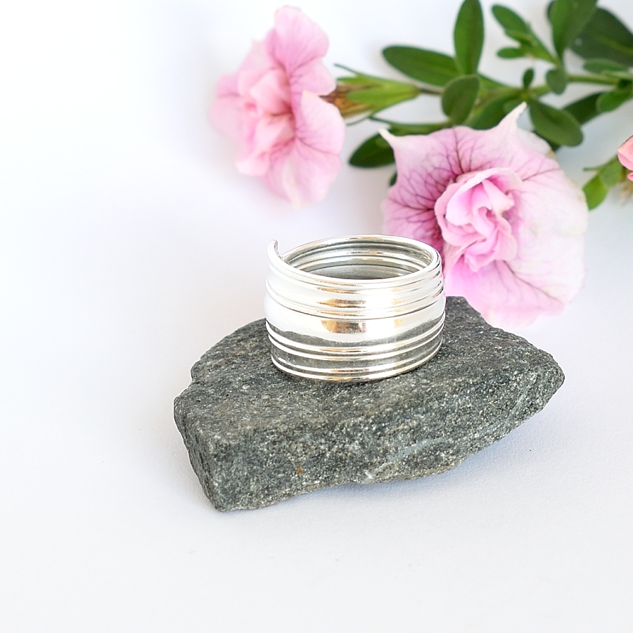 Margit-sormus, joka on valmistettu hopeisen Margit-lusikan varresta. Kauniin raitasormuksen leveys on 12 mm ja sen koko on 15+. Tämä ns. paperinkeräyslusikka on alun perin valmistettu vuonna 1964 ja sen hopeapitoisuus on 916.