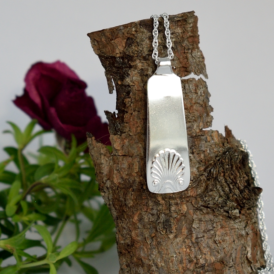 Musla-riipus, joka on muotoiltu hopeisen Musla-mokkalusikan varsiosasta. Lusikka on alun perin vuodelta 1983. Korun koko on 35 x 10 mm. Riipusketjun pituus on 45 cm.