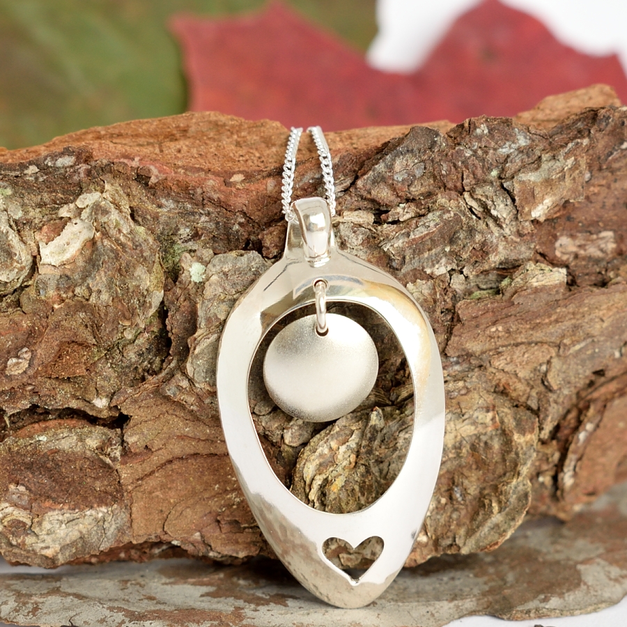 Olivia-riipus, joka on muotoiltu hopeisen kahvilusikan pesästä. Pesästä irrallaan roikkuva hopeinen pyörylä on hiekkapuhallettu. Korun alaosaan on sahattu pieni sydämen muotoinen aukko. Korun korkeus on 40 mm ja leveys 25 mm. Sterling-hopeisen riipusketjun pituus on 60 cm.