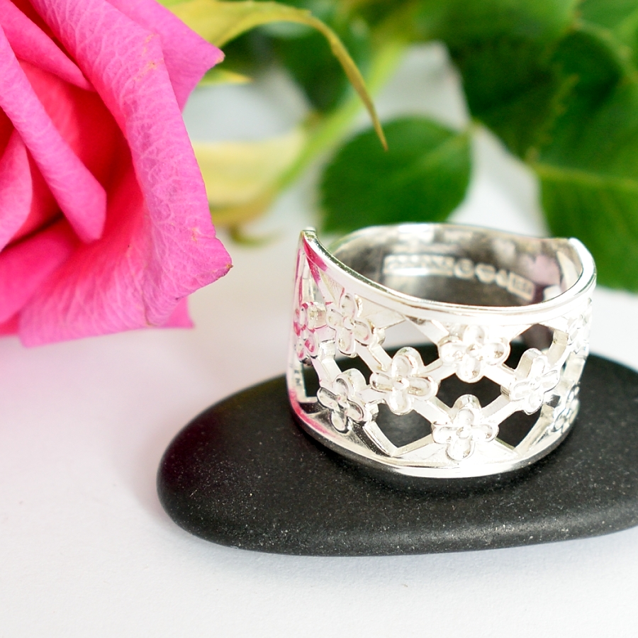 Princess-sormus, joka on valmistettu hopeisen ruotsalaisen kahvilusikan varresta. Sormuksen leveys on 14 mm leveimmästä kohdastaan. Lusikat ovat vuodelta 1967. Sormusta on valmistettu kolme eri kokoa, 17, 18+ ja 20-.