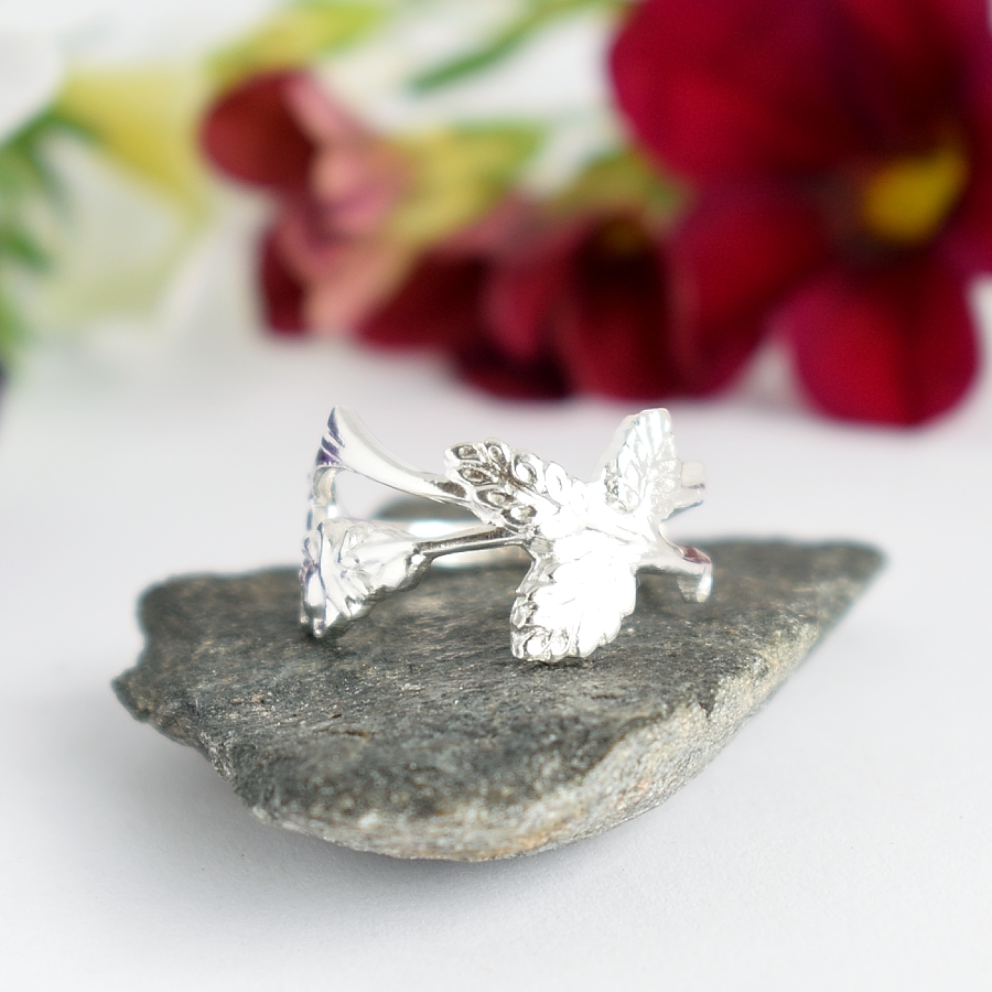 Ruusunoksa-sormus, joka on valmistettu hopeisen kahvilusikan varsiosasta. Lusikat ovat alun perin vuodelta 1993. Sormuksen leveys leveimmästä kohdastaan on 15 mm ja sitä on valmistettu kaksi eri kokoa 17+ ja 19,5.