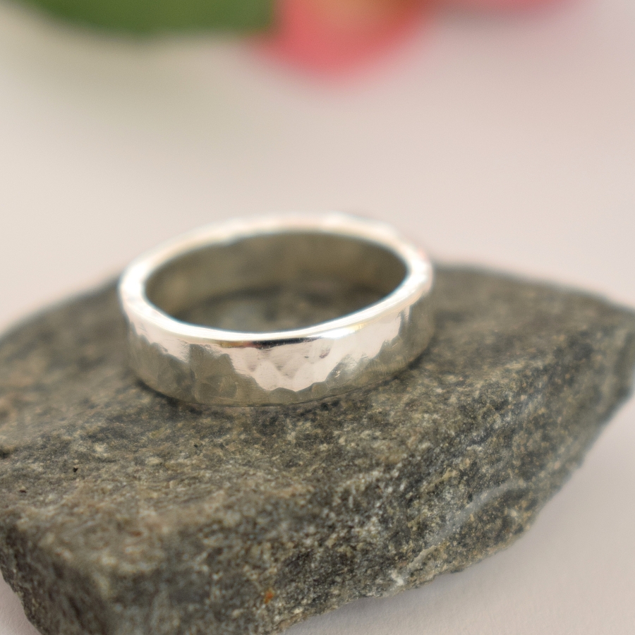 Säde-takosormus, joka on muotoiltu ohuen hopealusikan varsiosasta. Sormuksen pinta on taottu. Lusikka on alun perin vuodelta 1965. Sormuksen leveys on n. 3 mm ja koko 14. Soveltuu siis kokonsa vuoksi hyvin nivelsormukseksi.
