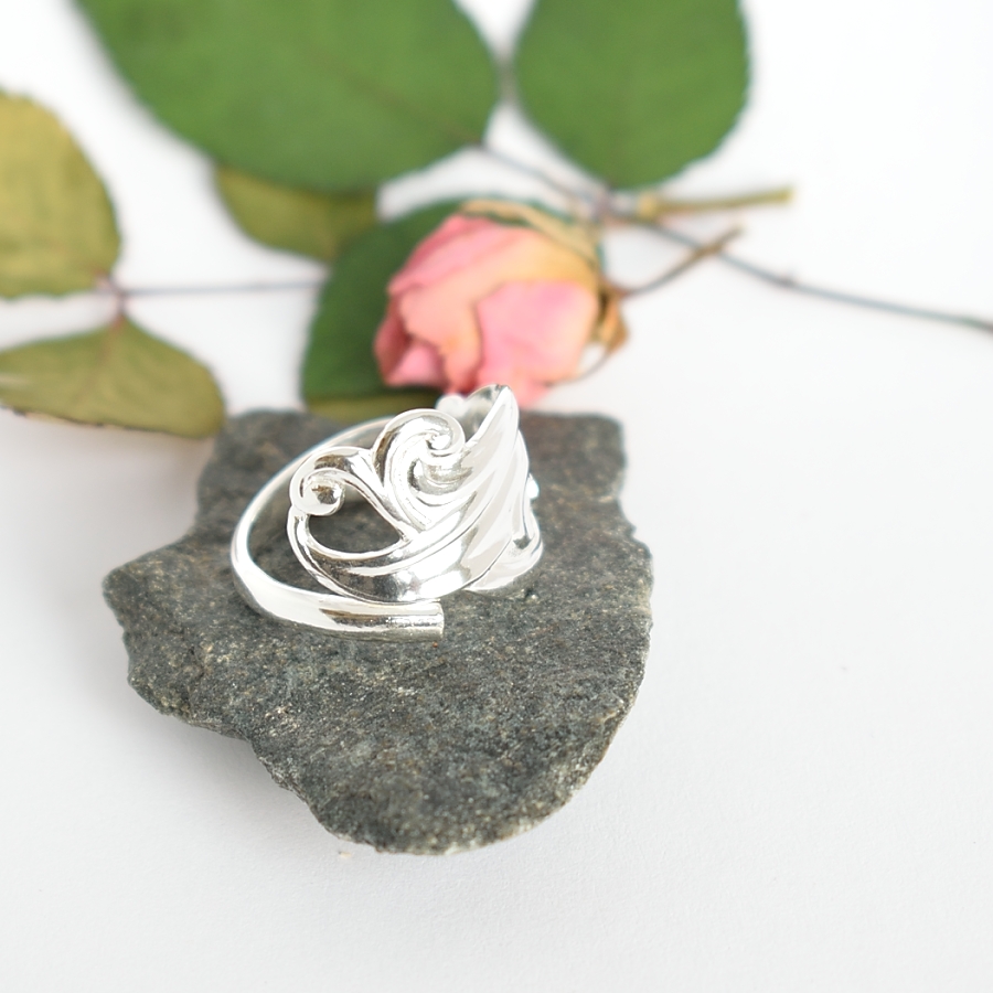 Sweetie-sormus, joka on valmistettu hopeisen kahvilusikan varresta. Sormus on kierresormus. Sen leveys on leveimmästä kohdastaan 15 mm. Lusikka on alun perin vuodelta 1948. Sormuksen koko on 18.