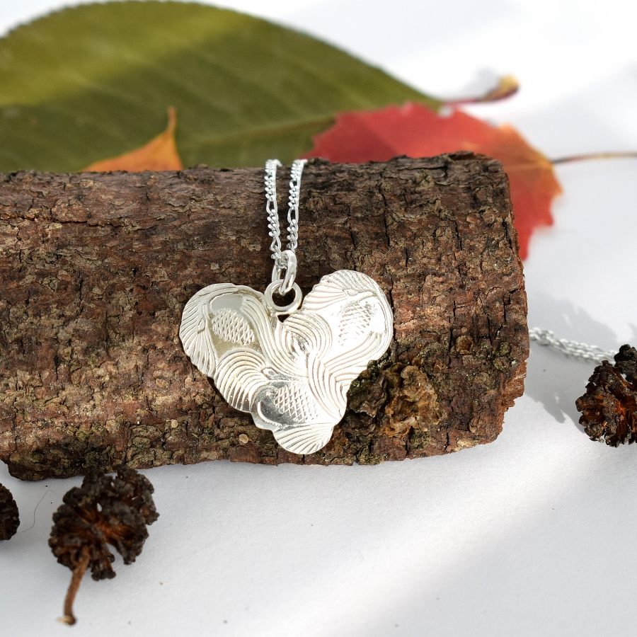Sydänkäpyni-riipus, joka on valmistettu hopeisten Käpy-kahvilusikoiden varsista. Pienen ja kauniin riipuksen koko on 25 x 20 mm ja Sterling-hopeisen riipusketjun pituus on 45 cm. Lusikat ovat alun perin vuodelta 1974.