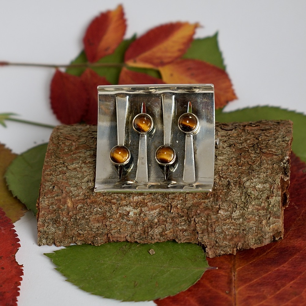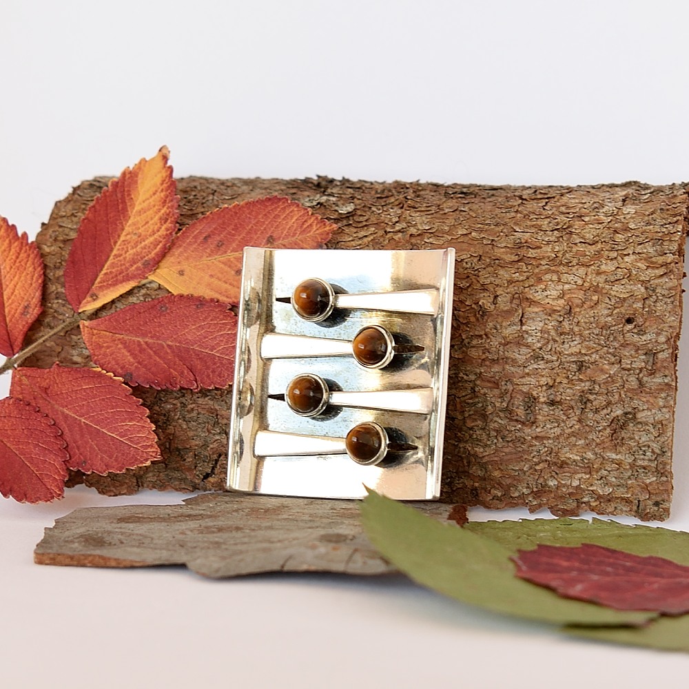 Tiikerinsilmä-rintaneula on kunnostettu ja puhdistettu vintage-tuote, jonka suunnittelija on Elis Kauppi. Upea rintaneula on vuodelta 1964 ja se on Kupittaan Kulta Oy:n valmistama. Korun taustaa on tummennettu tiikerinsilmäkivien kohdalta kontrastin aikaansaamiseksi. Rintaneulan koko on 32 x 28 mm ja sen hopeapitoisuus on 813 ja paino 13 g. Korun rintaneulamekanismi on suojattu tapilla, joten korua voi käyttää myös riipuksena, riipusketju ei kuulu korun hintaan.