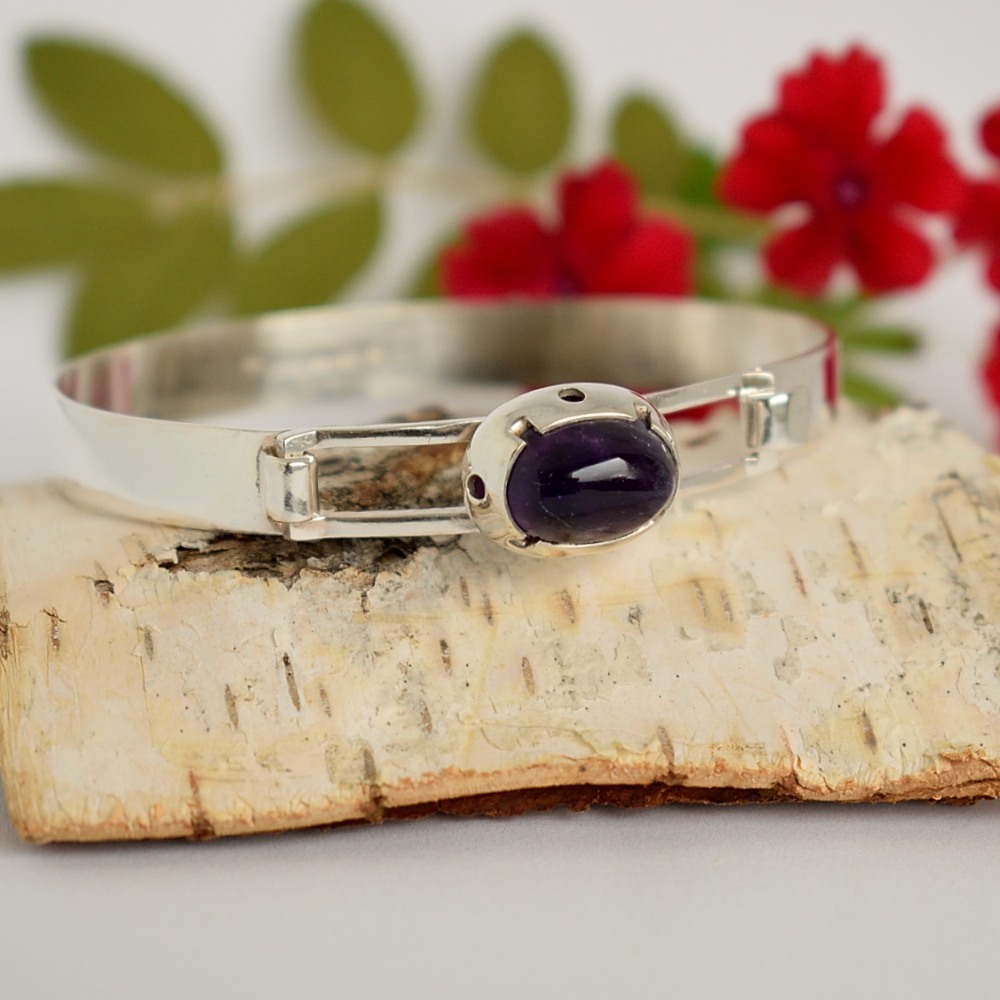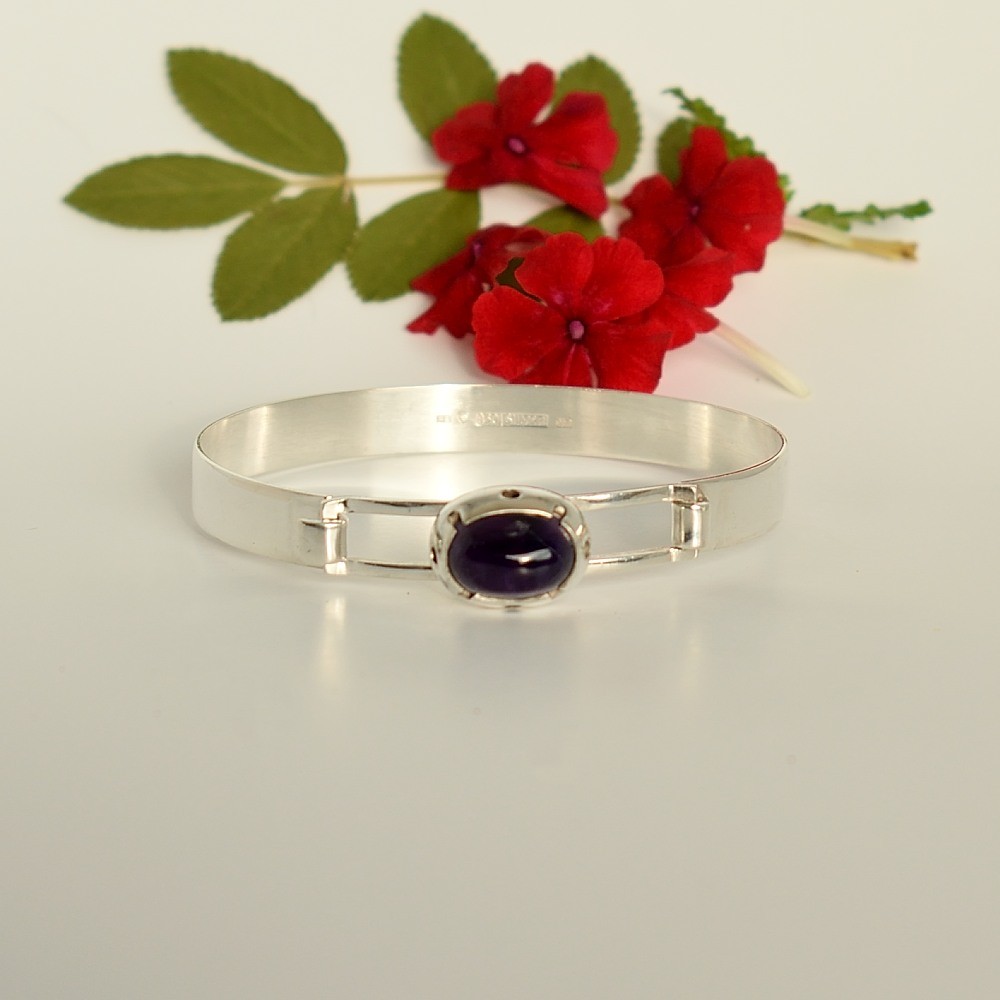 Vintage rannekoru ametistilla on helsinkiläisen Harry Bergmanin mallistoa vuodelta 1974. Tyylikkäässä ja kauniissa rannekorussa on kivenä ovaali tumma ametisti. Korun koristeosan korkeus on 10 mm ja leveys 12 mm. Koru on kunnostettu puhdistettu ja kiillotettu vintage-tuote, jonka hopeapitoisuus on 830. Rannekorun sisämitta on n. 17,5-18 cm. Korussa on pitävä kiinnitys ja se on helppo kiinnittää itse omaan ranteeseen.
