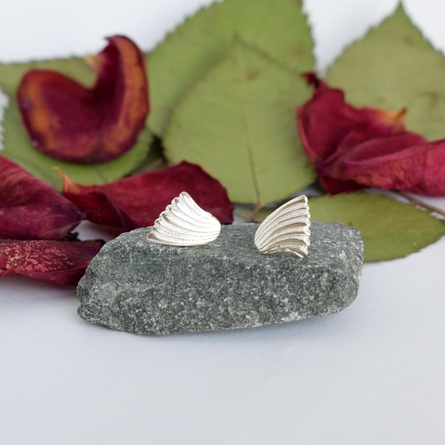 Viuhka-korvakorut, jotka on muotoiltu hopeisten lusikoiden varsista. Korvakoruissa on tappikiinnitys ja niiden koko on 10 x 7 mm. Lusikat ovat alunperin vuodelta 1953.